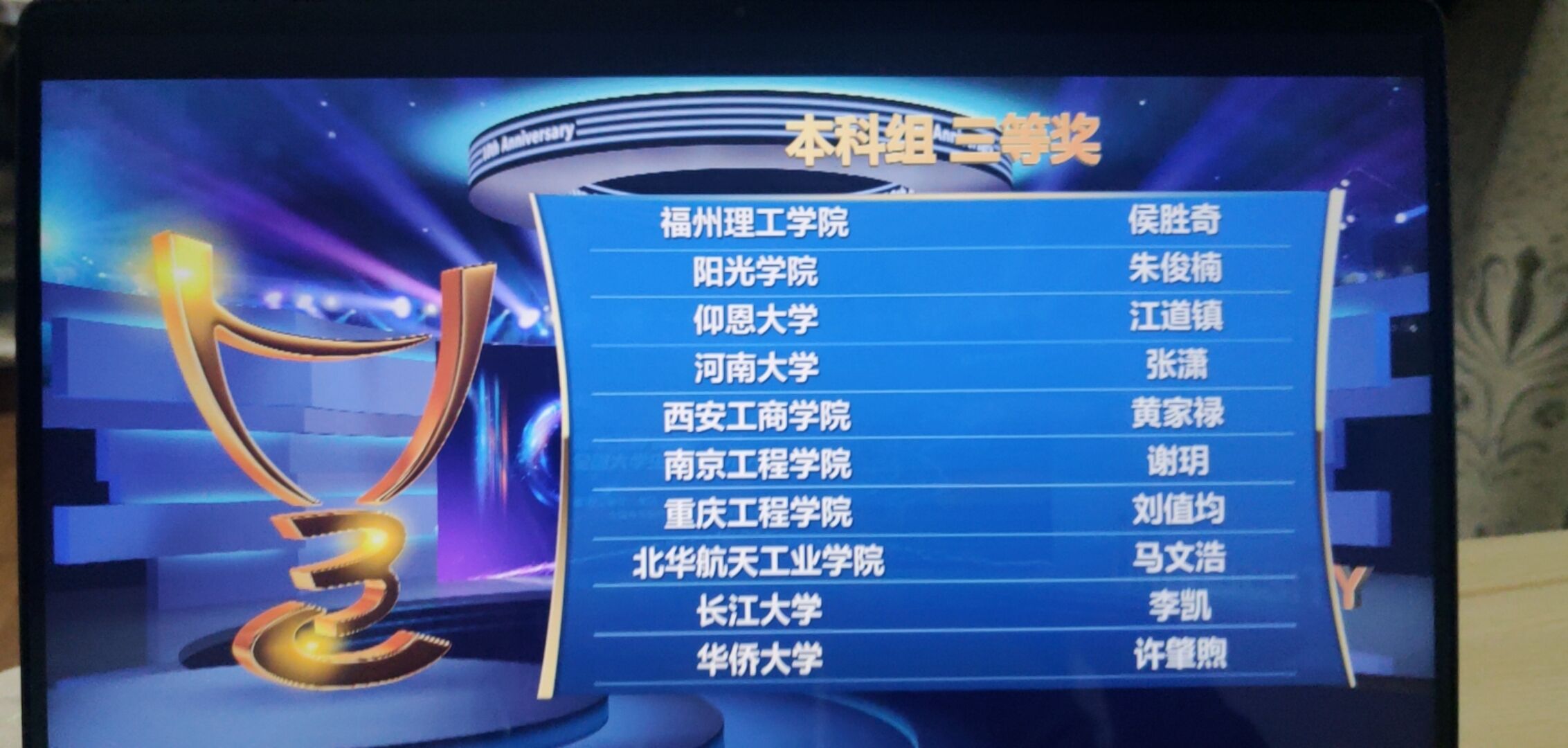 2020年12月5日,“新华三杯”全国大学生数字技术大赛决赛在泉州信息工程学院举办。经过预赛选拔,我校共有3名同学(江道镇、陈鑫、严钟灵)进入决赛,江道镇同学在本次比赛中荣获三等奖,陈鑫、严钟灵同学荣获优胜奖。