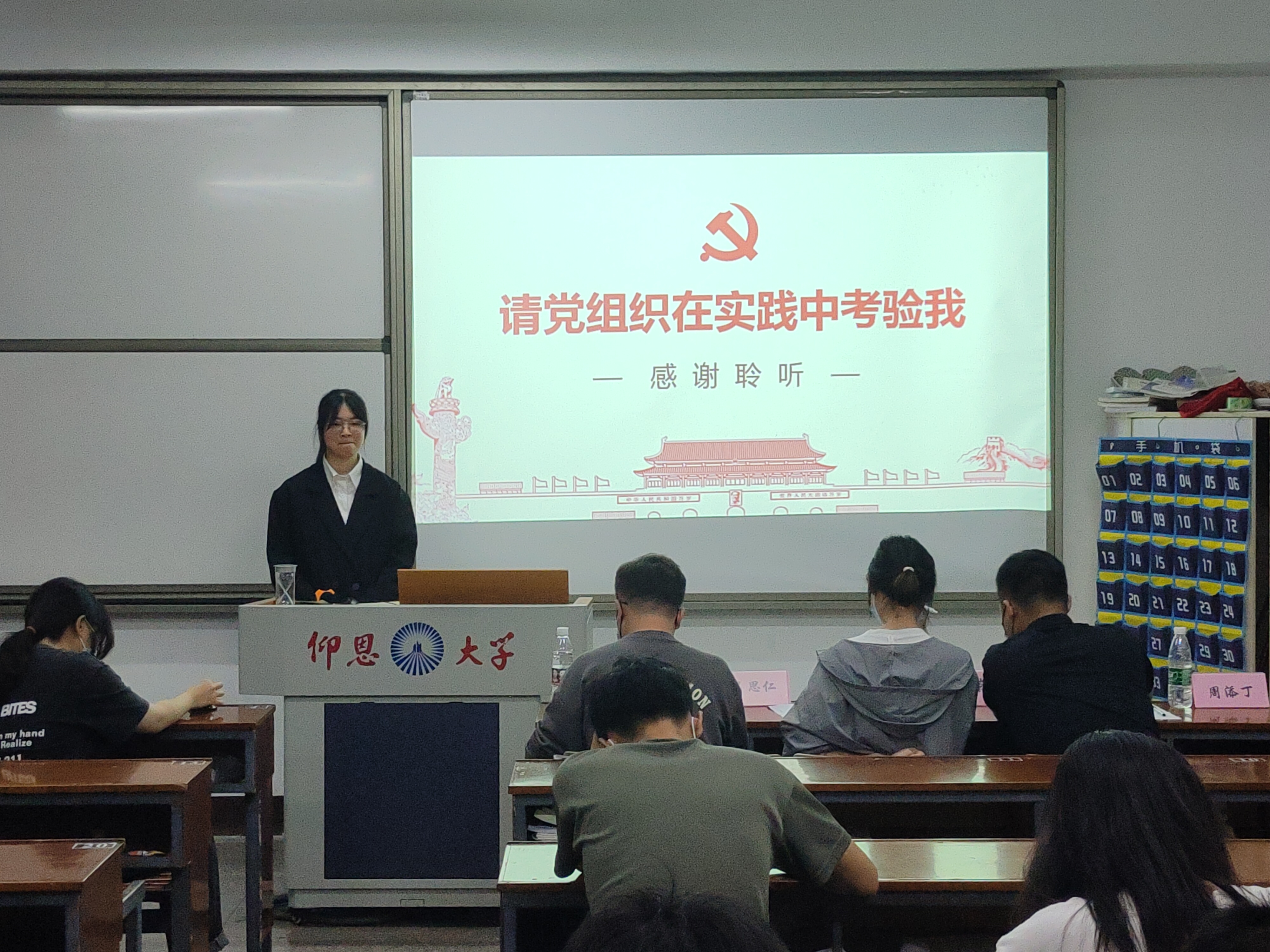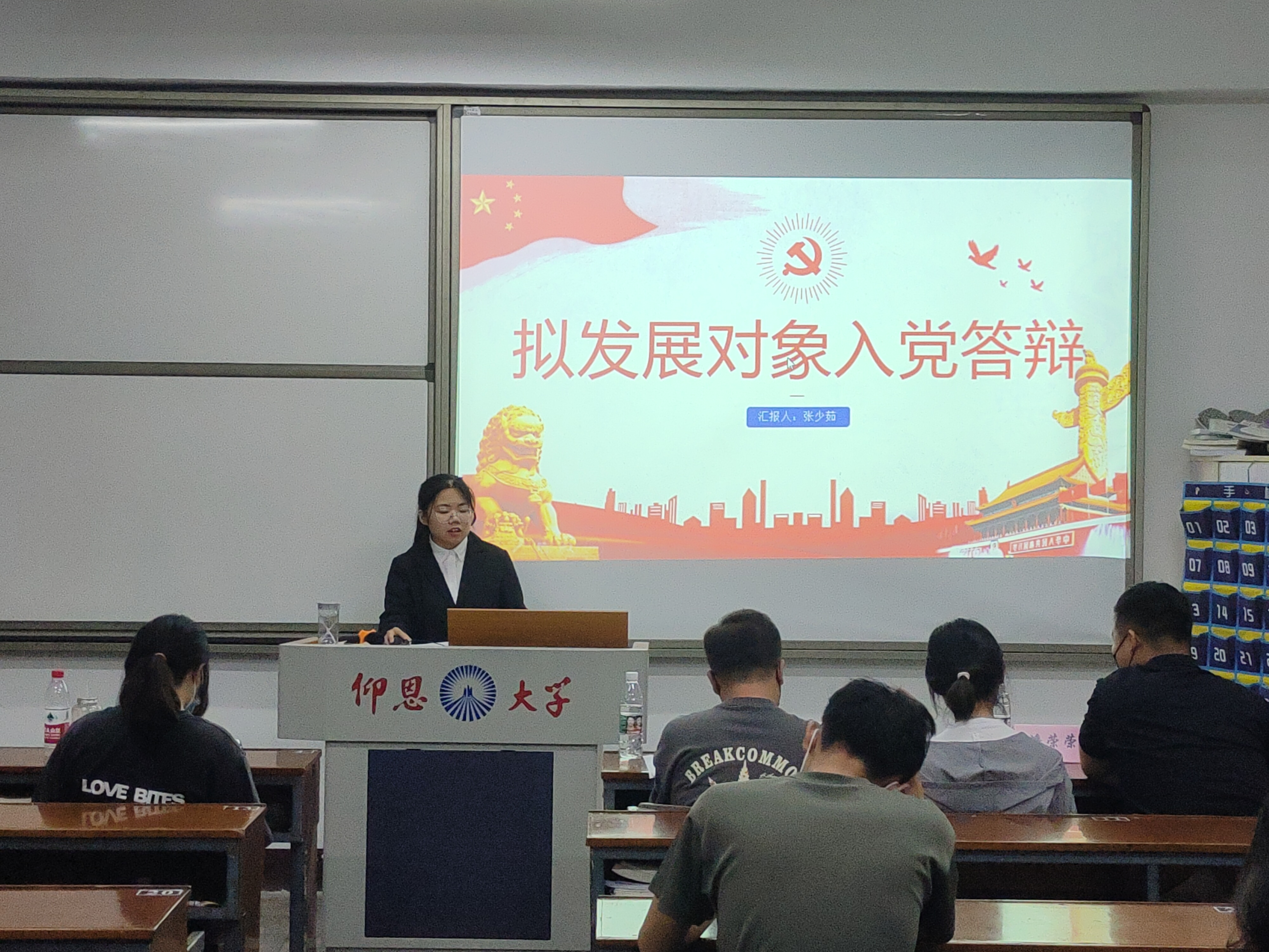 31名拟发展对象依次走向讲台,结合入党动机以及各自的成长经历进行展示,每位拟发展对象阐述完入党动机之后,由主持人从题库中抽取党史知识必答题,时政选答题现场作答,随后由答辩评审团的老师结合党的理论知识和具体案例随机对拟发展对象进行提问并打分。