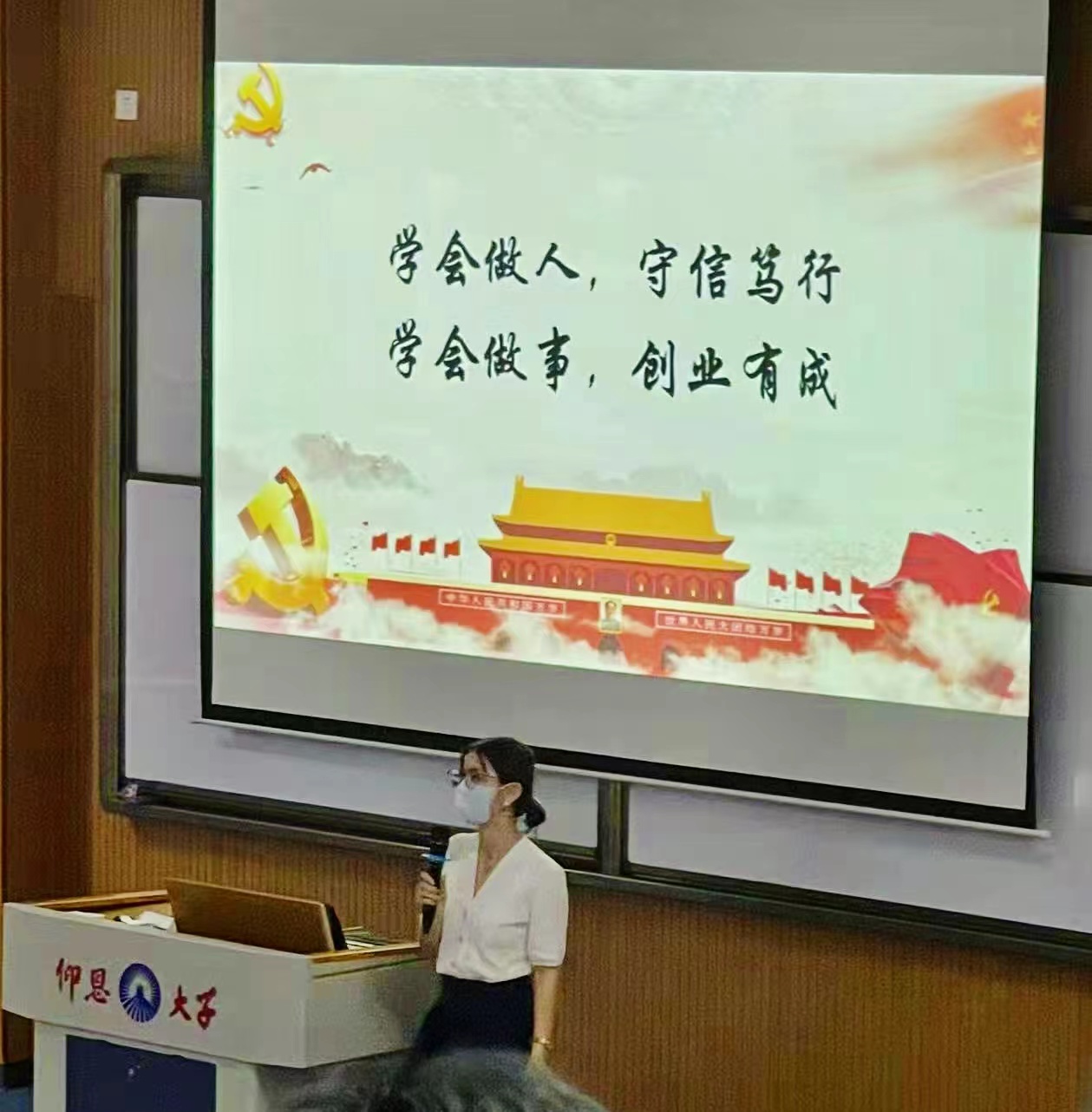 李昭在党团教育大会上向新生介绍入团流程,鼓励新生在青春的赛道上跑出最好的成绩,早日加入中国共产主义青年团,然后详细讲述团组织推优入党流程。最后李昭以校训“学会做人,守信笃行;学会做事,创业有成”勉励所有新生保持昂扬的姿态开展大学生活,以优异的成绩迎接党的二十大顺利召开。