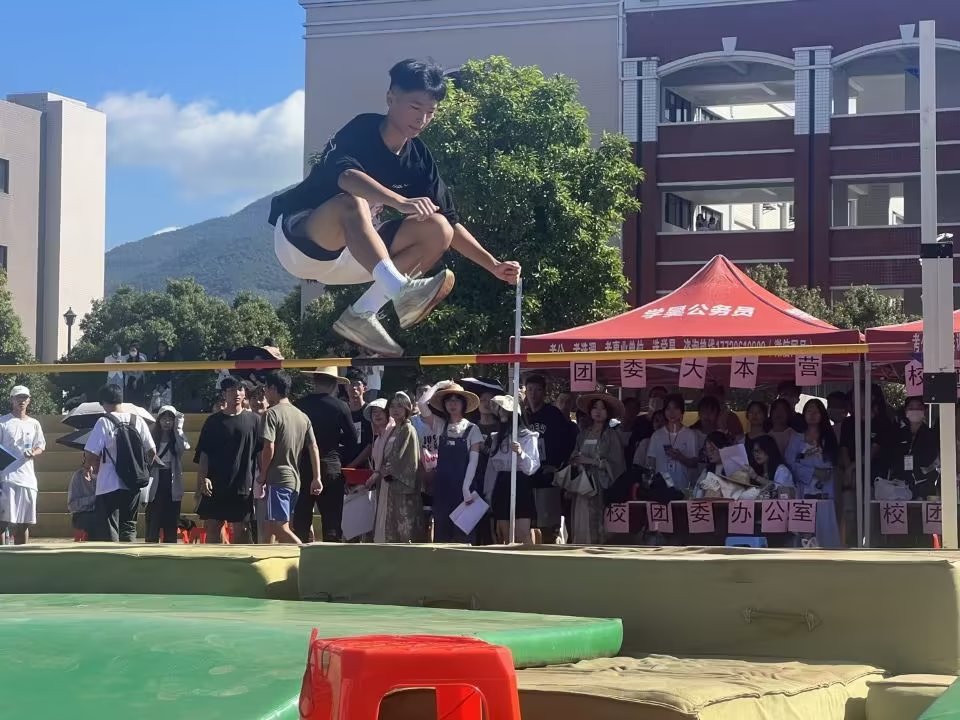 跳高比赛中,曾沐茵、连俏茹同学目视前方,起跑,加速,腾空,过杆,落地,完美的飒爽英姿永远定格在现场每一个人的心中。