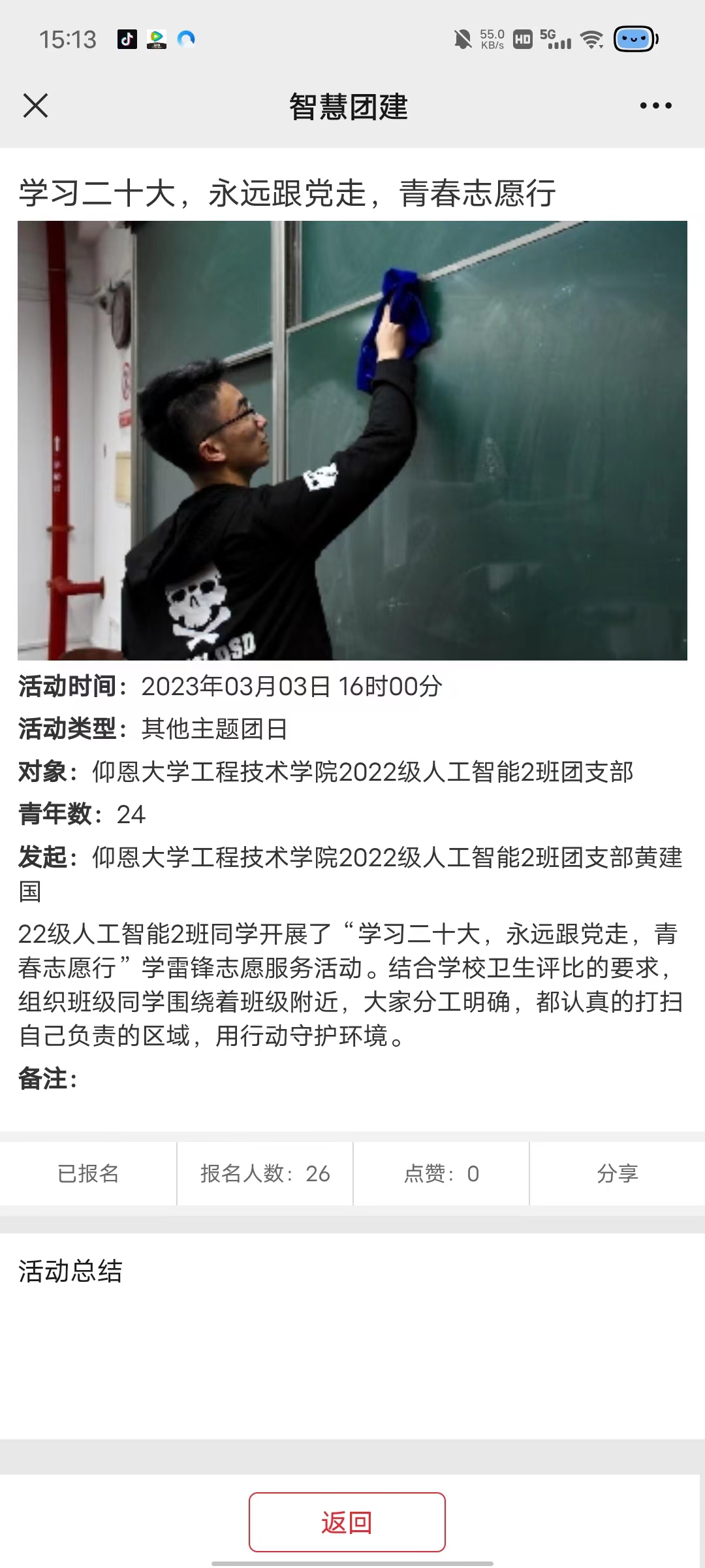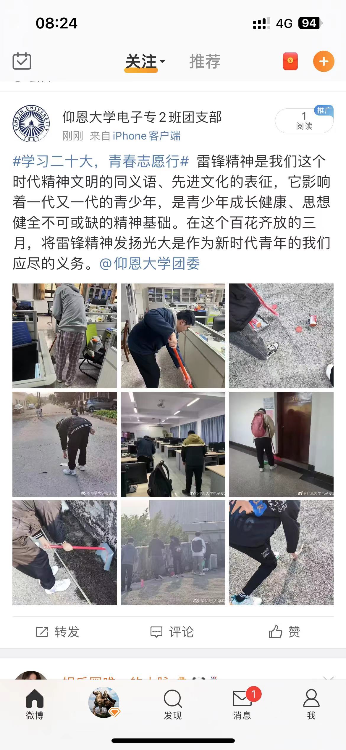 活动后各团支部也通过微博、微信、智慧团建等媒介来大力宣传雷锋精神的时代意义和学雷锋先进典型,使本次活动深入且高效的展开在各班级乃至校内营造一种积极健康向上的舆论氛围,让雷锋精神得以发扬。