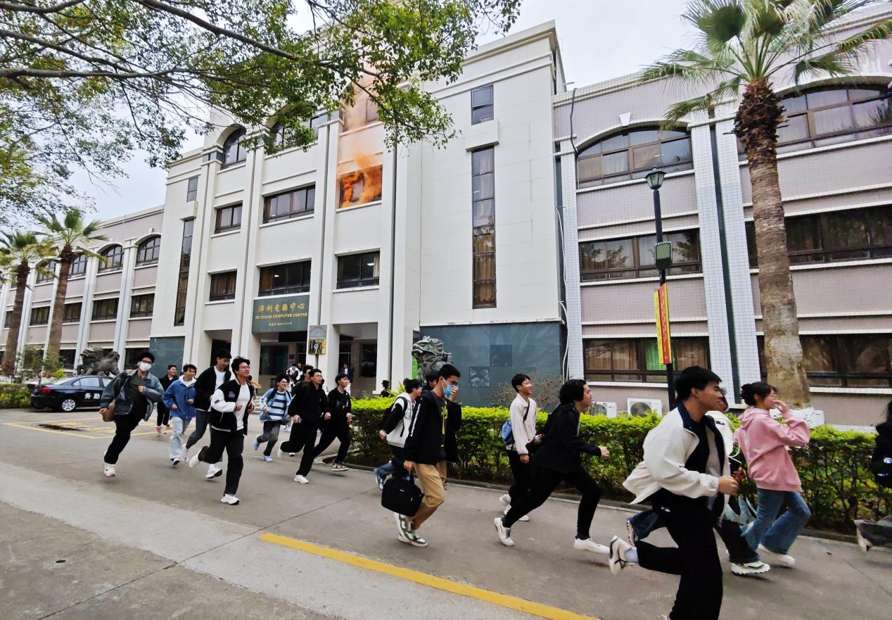 随着警报声的响起,演练正式开始。现场设立了模拟火灾场景,浓烟弥漫,紧张的氛围强调了演练的真实性。值班安保人员及时发现火情并迅速通知了校园内的110联动指挥中心。指挥中心立即启动应急预案,协调校微型消防站、雏鹰应急处置分队和校医务所等相关部门前往现场。学生们迅速而有序地按照指定的疏散路线撤离教室,整个过程井然有序。