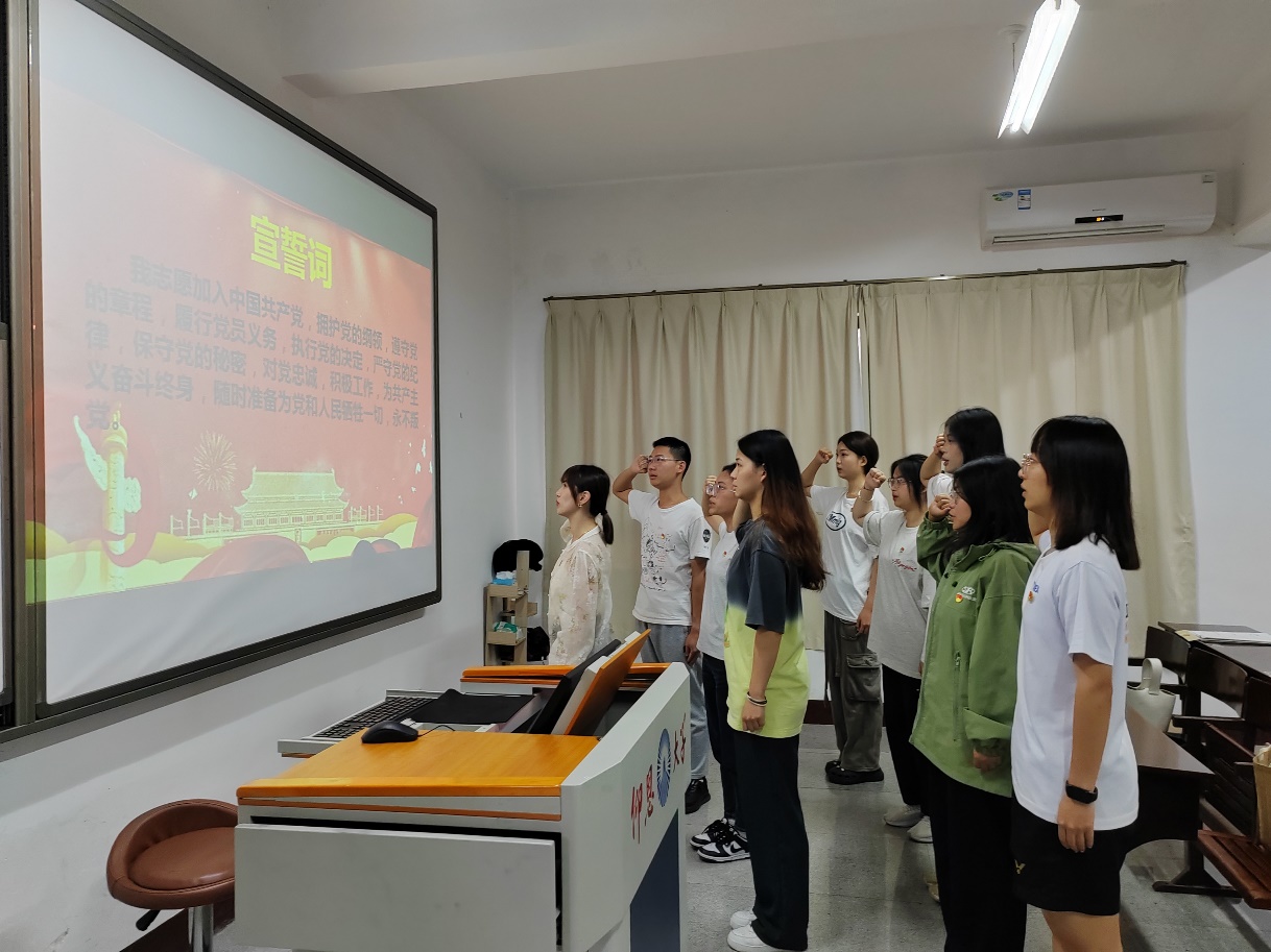 全体党员进行入党宣誓,表明将时刻以一名共产党员的标准严格要求自己,坚定不移听党话、跟党走。在今后的学习生活中严格要求自己,时刻发挥党员的先锋模范带头作用。