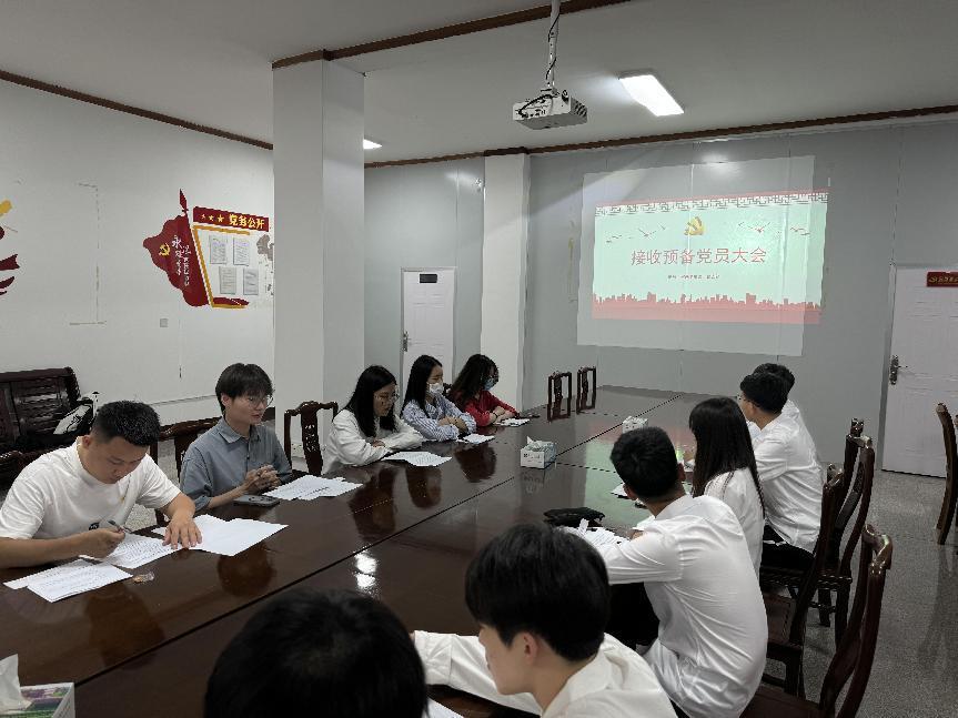 党支部书记林嘉豪宣读与会人员情况并宣读大会流程,强调会议的相关注意事项。大会采取无记名投票方式进行表决,一致同意刘培莹等4名同志发展为预备党员。随后,党员为新发展的党员佩戴党徽,并由支部书记带领全体预备党员庄严宣誓。