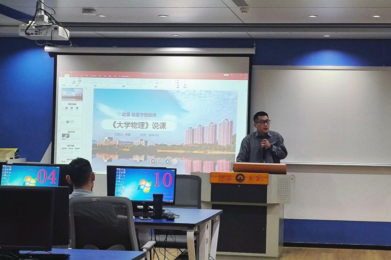 在说课环节,李磊老师以《大学物理》课程为例,演示了说课的方法:通过教材分析、学情分析、重难点分析、学生学法分析、教师教法分析、教学过程设计、课程思政、前沿知识拓展、课后作业、教学反思等环节,展示了教师在教学全过程中的思考与实施过程,并与初次走上讲台的老师们分享了他在教学中的一些创新做法和所取得的成效。他的分享为青年教师提供了教学中的思路与方法。