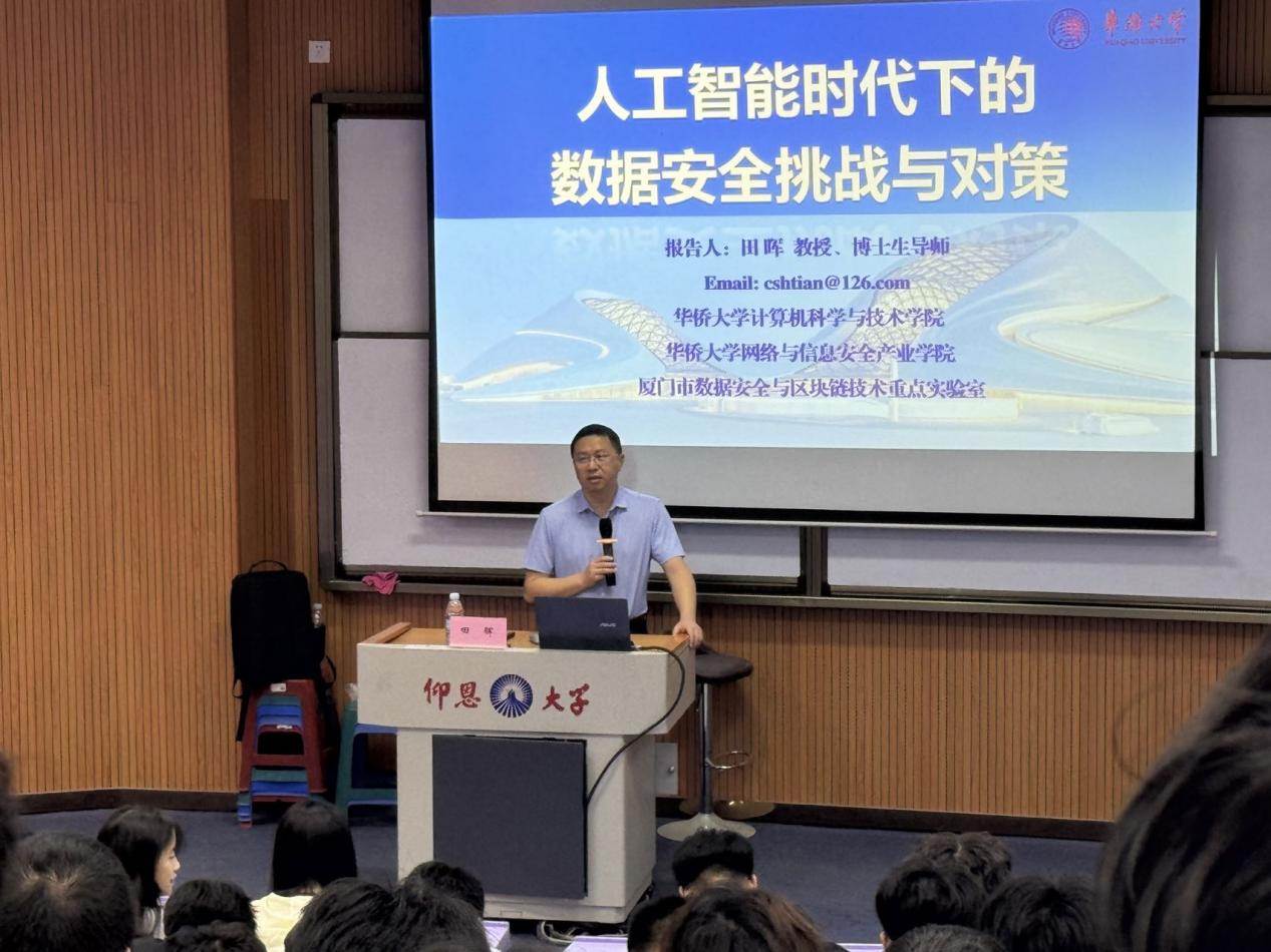 11月4日下午,完美体育官方网站在和昌教学楼博雅讲堂举办题为“人工智能时代下的数据安全挑战与对策”的主题讲座。华侨大学计算机科学与技术学院院长田晖教授莅临本校进行演讲,完美体育官方网站师生代表到场聆听。