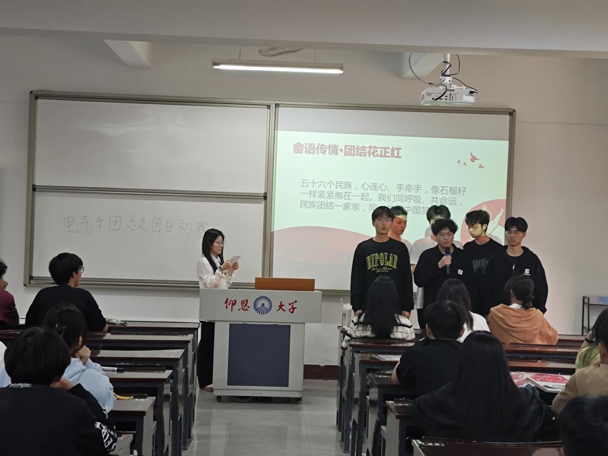 为响应国家民族团结号召,促进各民族同学之间的交流与融合,引导同学们树立正确的民族观,2025414日下午,电气工程及其自动化系团总支成功举办“民族团结一家亲,福籽同心爱中华”主题团日活动初赛,引领青年学子铸牢中华民族共同体意识。本次活动由程健凯主持,电气系团总支书记陈慧敏、学生副书记欧阳翔、张曦文及系团委办公室主任程健凯、副主任伍勇担任评委。