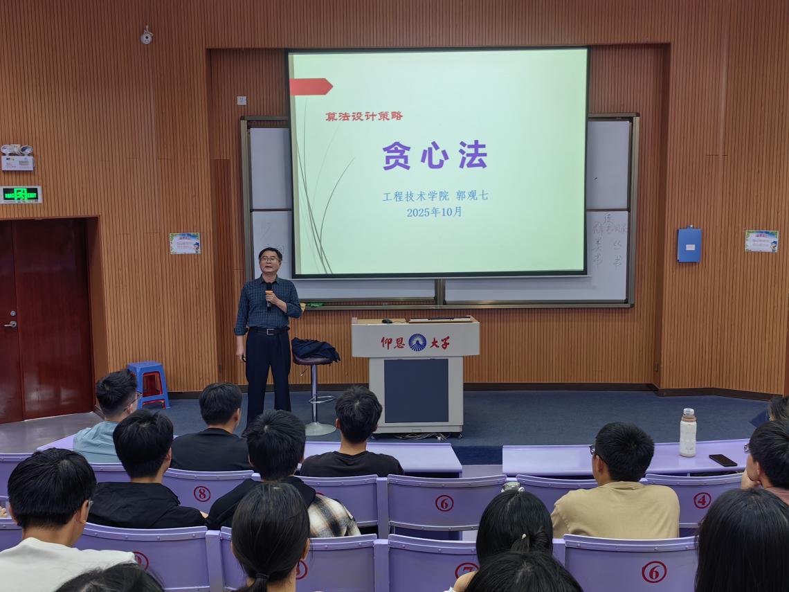 2025年10月29日下午,由完美体育官方网站主办的第66讲仰恩大讲堂在新区和昌楼博雅讲堂成功举办。本次讲座特邀工学博士、硕士生导师郭观七教授主讲,围绕 “贪心法在算法设计与分析中的应用” 展开本次分享。大数据、人工智能专业学生及部分优秀学生代表参会,现场学术氛围浓厚。