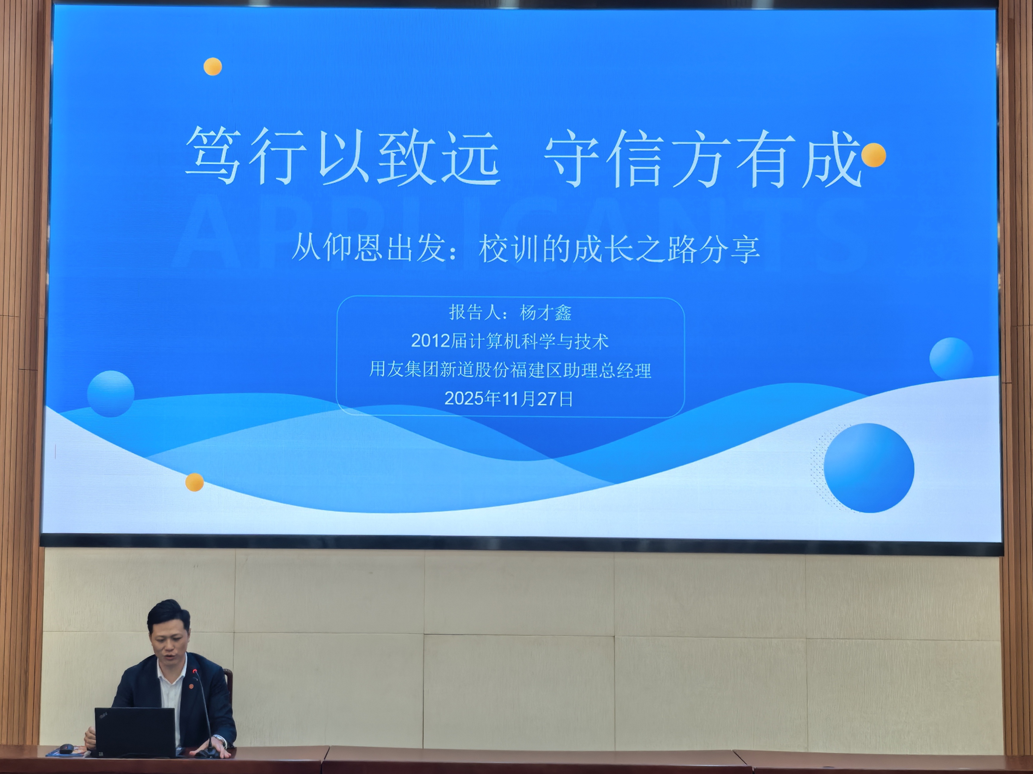 11月27日下午,完美体育官方网站在旧区多功能学术报告厅举办“校友大讲堂”活动。2012届计算机科学与技术专业优秀校友,用友集团新道股份福建区助理总经理杨才鑫重返母校,以“笃行以致远,守信方有成——从仰恩出发:校训的成长之路分享”为主题分享经验。完美体育官方网站常务院长金承勇主持活动,两百余名师生参与交流。