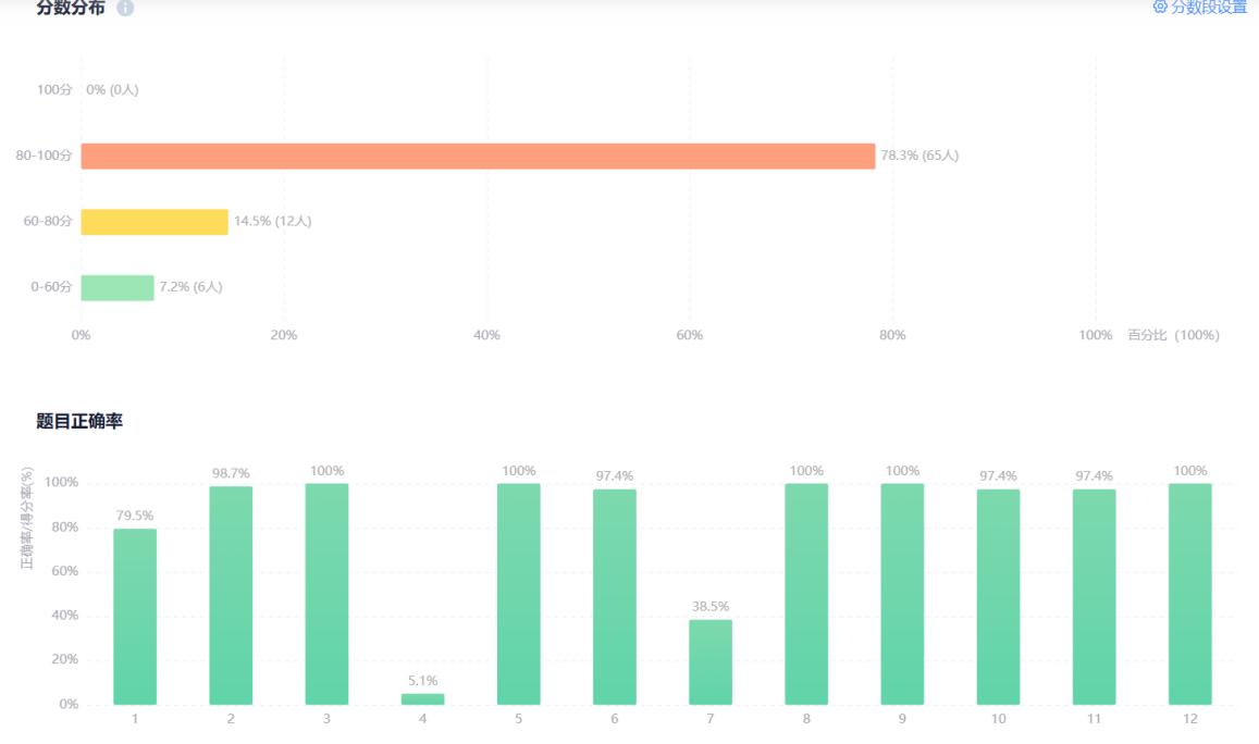 在线上竞赛阶段,参赛学生通过学习通平台进行消防安全知识答题,内容涵盖消防法律法规、日常防火常识、火灾逃生技能等。本次测评成绩亮眼,优秀率近八成,但同时发现了明显的“知识盲点”。近八成(78.3%)参与者达到优秀水平,显示出普遍的高水准。但题目正确率分析却揭示了不均衡之处:在超过10道题目正确率高于97%的同时,也存在个别题正确率较低。